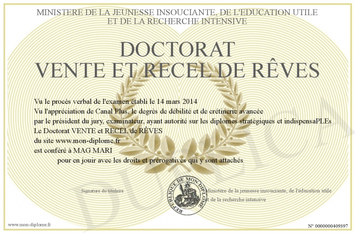 Envoyez par email votre Doctorat VENTE et RECEL de RÊVES personalisé