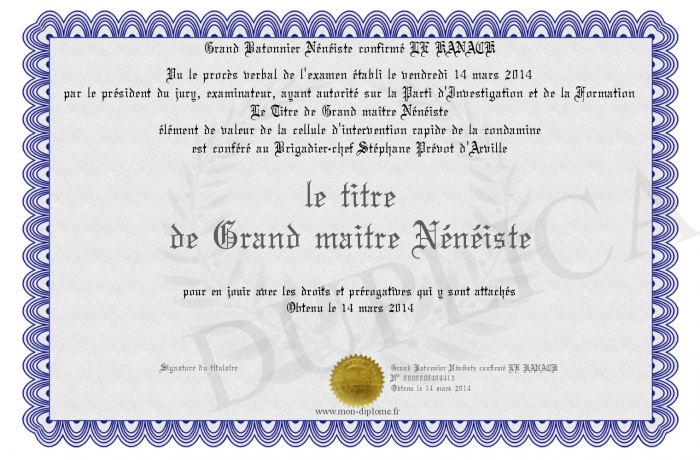 Envoyez par email votre le titre de Grand maitre Nénéiste personalisé