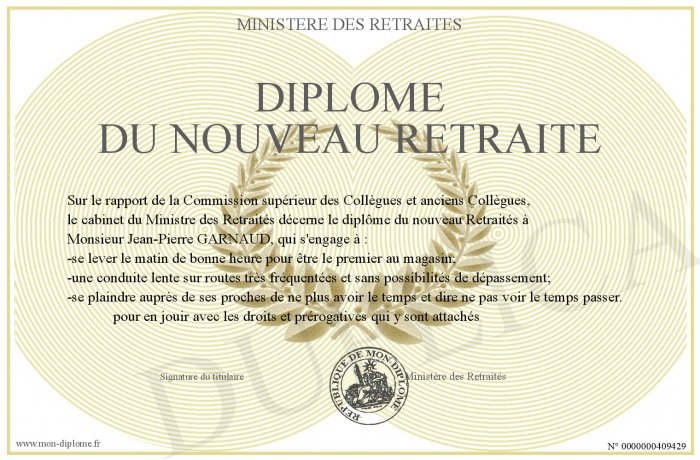 Envoyez par email votre Diplôme du nouveau Retraité personalisé