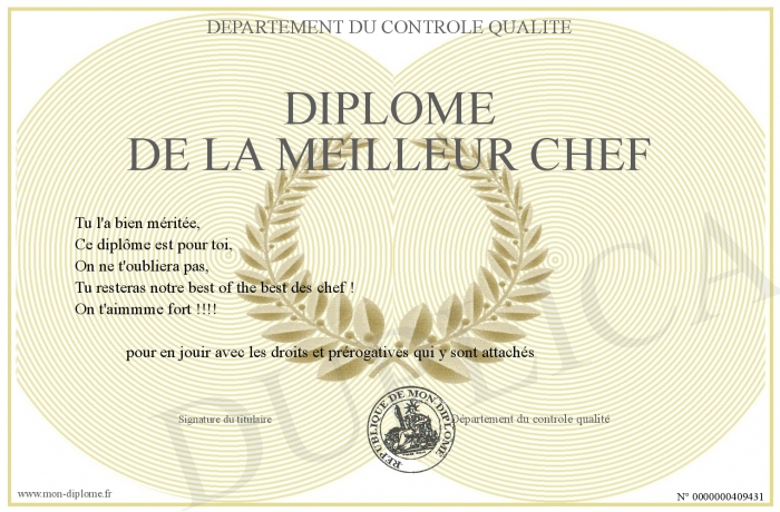 Envoyez par email votre Diplôme de la meilleur chef personalisé