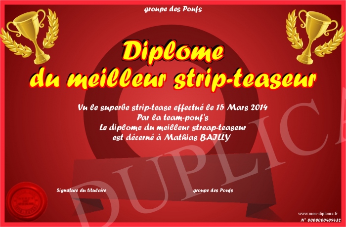 Envoyez par email votre Diplôme du meilleur strip-teaseur personalisé