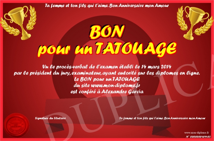 Envoyez par email votre BON pour un TATOUAGE personalisé