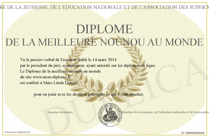 Envoyez par email votre Diplôme de la meilleure nounou au monde personalisé