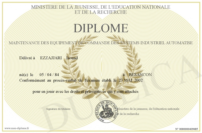 Envoyez par email votre Diplôme Maintenance des Equipement de Commande des Systems Industriel Automatisé personalisé