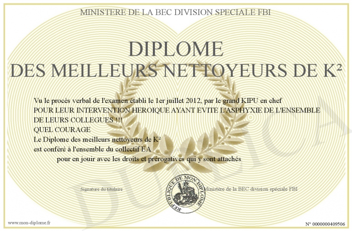 Envoyez par email votre Diplôme des meilleurs nettoyeurs de K² personalisé