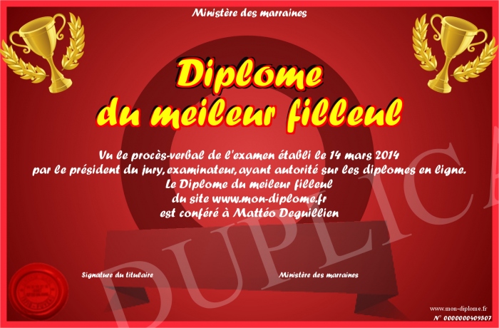 Envoyez par email votre Diplôme du meileur filleul personalisé