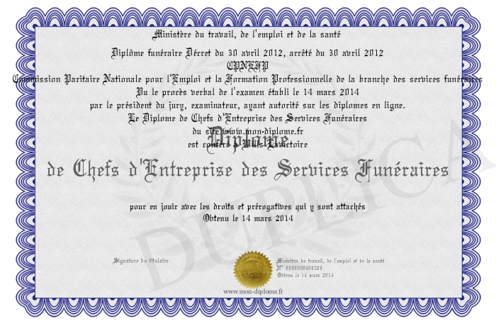 Envoyez par email votre Diplome de Chefs d'Entreprise des Services Funéraires personalisé