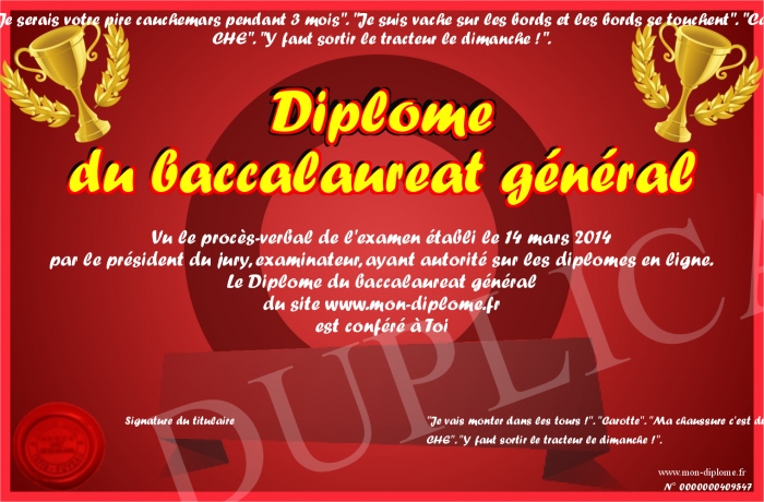Envoyez par email votre Diplôme du baccalaureat général personalisé