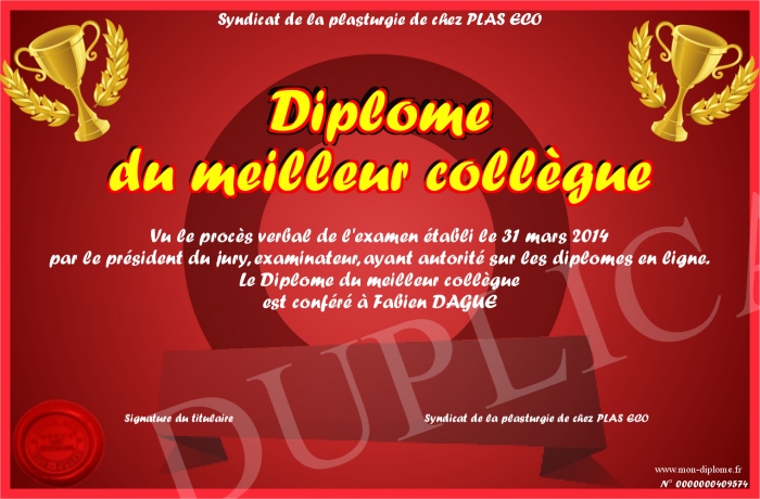 Envoyez par email votre Diplome du meilleur collègue personalisé