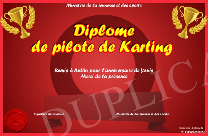 Envoyez par email votre Diplôme de pilote de Karting personalisé