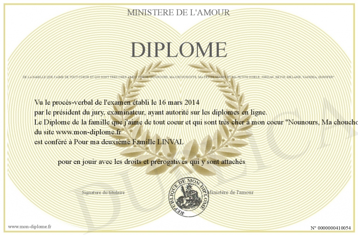 Envoyez par email votre Diplôme de la famille que j'aime de tout coeur et qui sont très cher à mon coeur -Nounours, Ma chouchoute, ma petite Mamie et ma petite Gisèle, Jordan, Kevin, Mélanie, Vanessa, Jennifer- personalisé