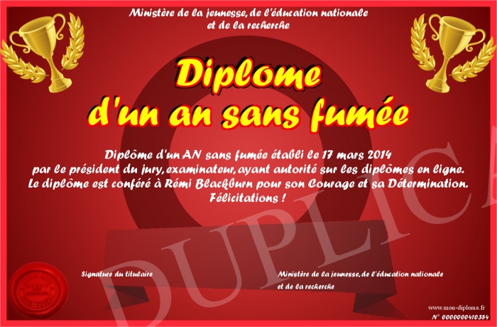 Envoyez par email votre Diplôme d'un an sans fumée personalisé