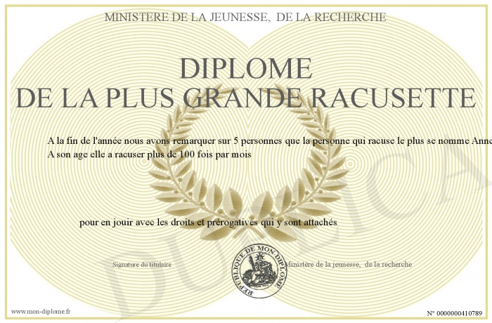 Envoyez par email votre Diplôme de la plus grande racusette personalisé