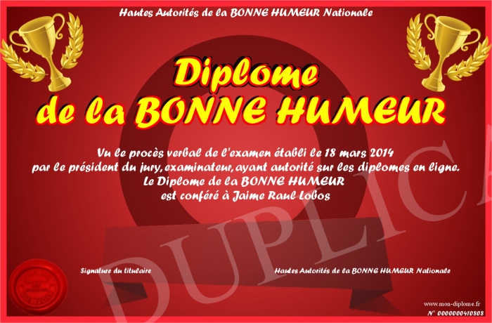 Envoyez par email votre Diplôme de la BONNE HUMEUR personalisé