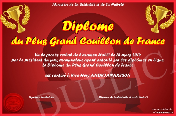 Envoyez par email votre Diplôme du Plus Grand Couillon de France personalisé