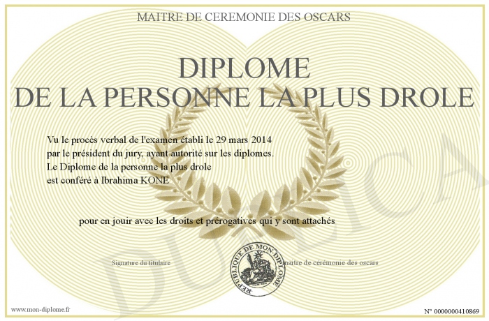 Envoyez par email votre Diplôme de la personne la plus drole personalisé