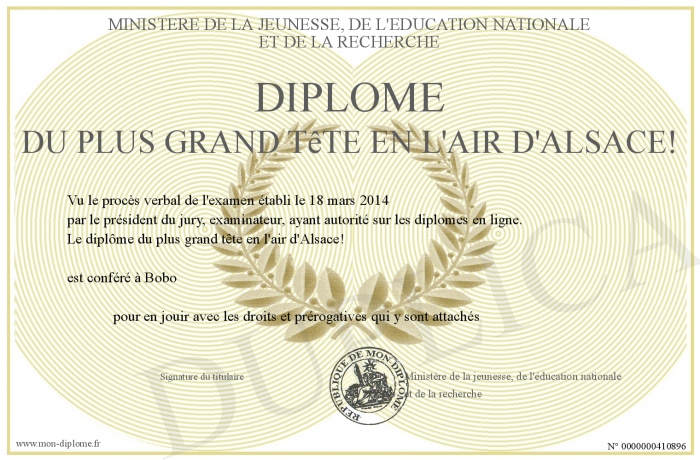 Envoyez par email votre Diplôme du plus grand tête en l'air d'Alsace! personalisé