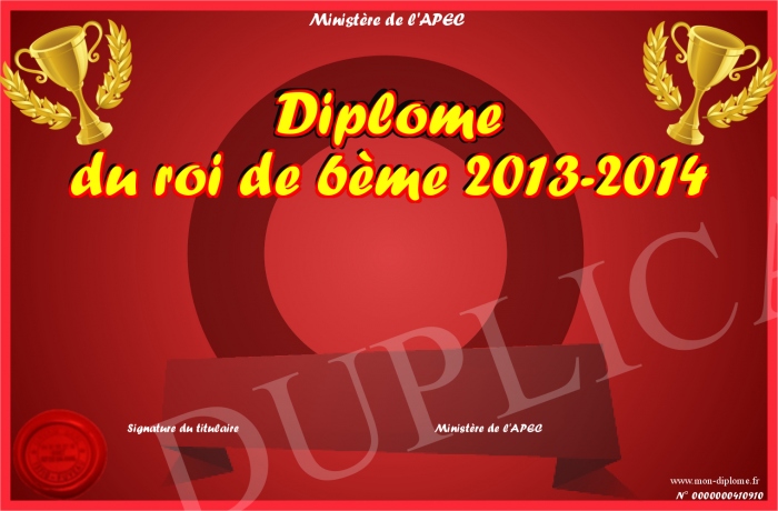Envoyez par email votre Diplôme du roi de 6ème 2013-2014 personalisé