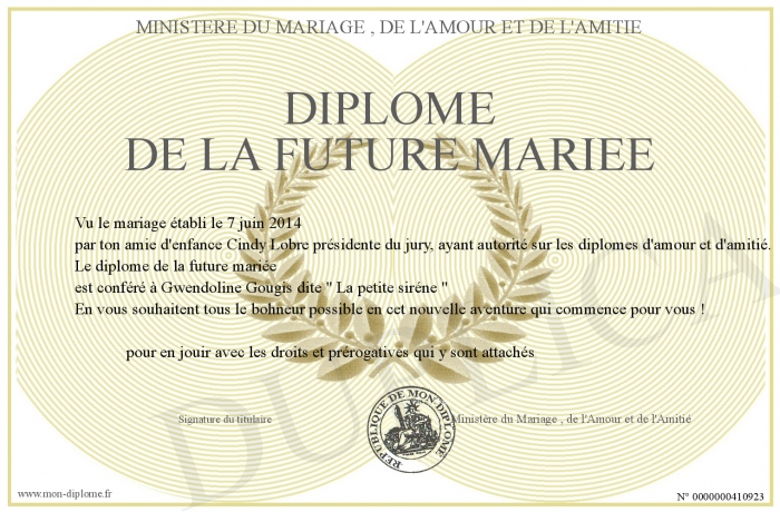 Envoyez par email votre Diplôme de la future mariée personalisé