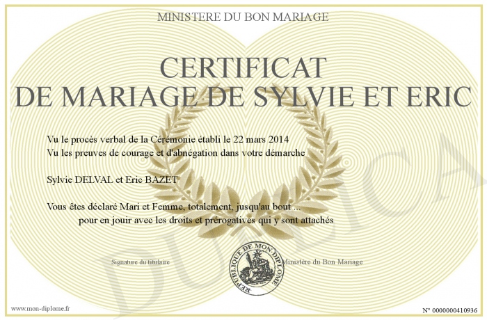 Envoyez par email votre CERTIFICAT DE MARIAGE DE SYLVIE ET ERIC personalisé
