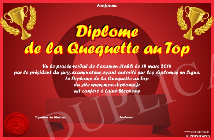 Envoyez par email votre Diplôme de la Quequette au Top personalisé