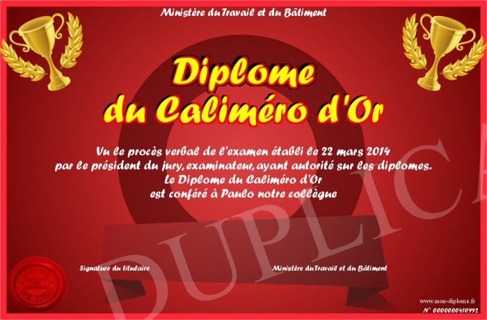 Envoyez par email votre Diplôme du Caliméro d'Or personalisé