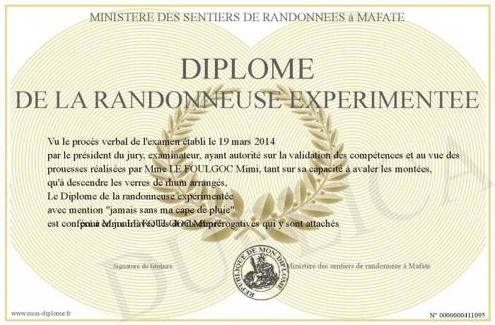 Envoyez par email votre Diplôme de la randonneuse expérimentée personalisé