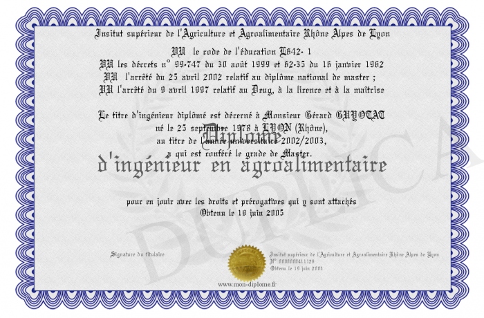 Envoyez par email votre Diplôme d'ingénieur en agroalimentaire personalisé