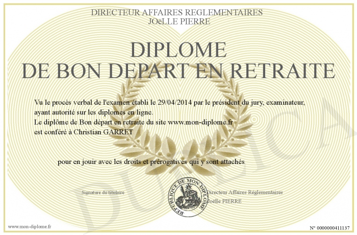 Envoyez par email votre Diplôme de Bon départ en retraite personalisé