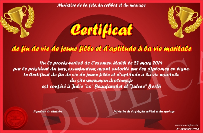 Envoyez par email votre Certificat de fin de vie de jeune fille et d'aptitude à la vie maritale personalisé