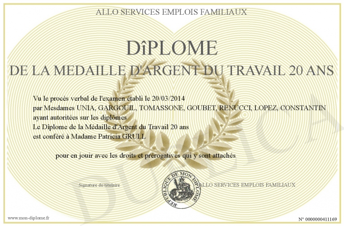 Envoyez par email votre Dîplome de la Médaille d'Argent du Travail 20 ans personalisé
