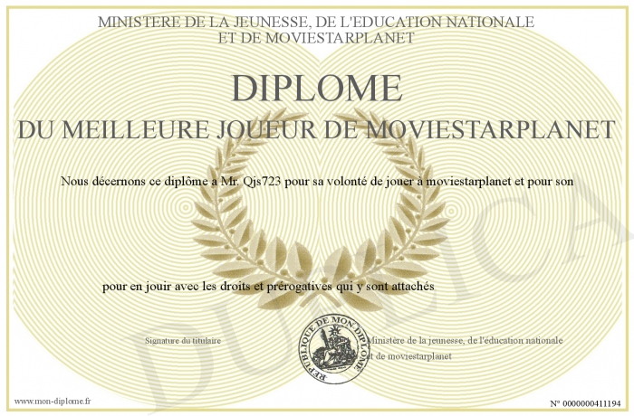Envoyez par email votre Diplôme du meilleure joueur de moviestarplanet personalisé