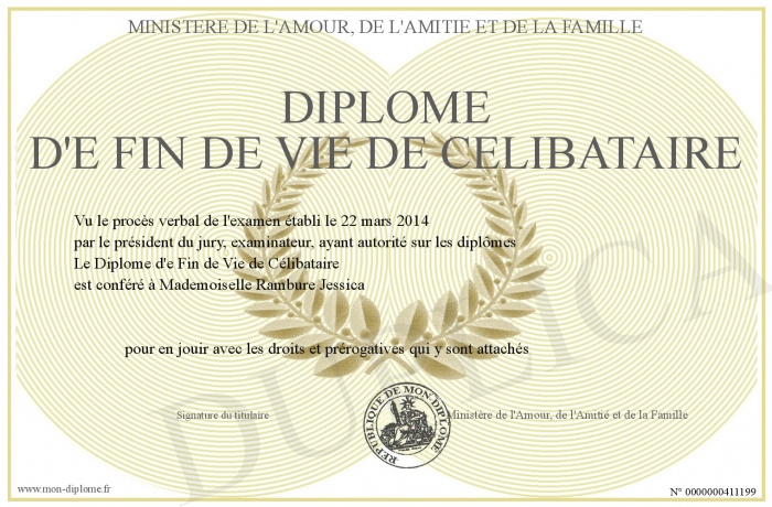 Envoyez par email votre Diplôme d'e Fin de Vie de Célibataire personalisé