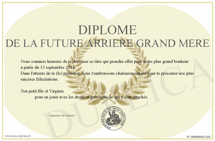 Envoyez par email votre Diplôme de la Future Arrière Grand Mère personalisé