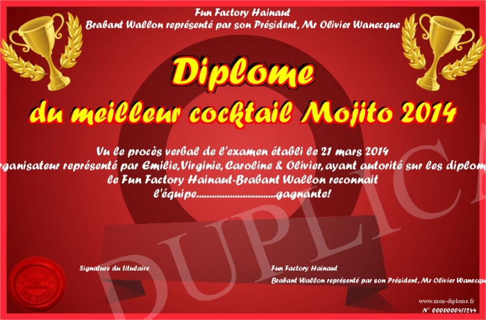 Envoyez par email votre Diplôme du meilleur cocktail Mojito 2014 personalisé