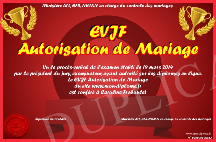 Envoyez par email votre EVJF Autorisation de Mariage personalisé