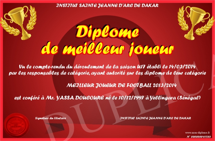 Envoyez par email votre Diplome de meilleur joueur personalisé