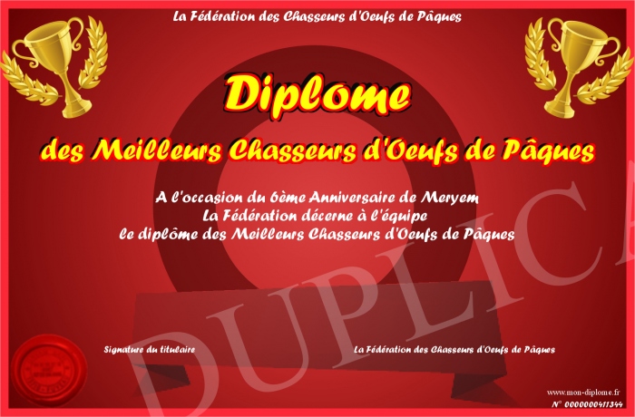 Envoyez par email votre Diplôme des Meilleurs Chasseurs d'Oeufs de Pâques personalisé