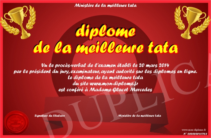 Envoyez par email votre diplôme de la meilleure tata personalisé
