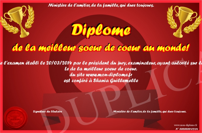 Envoyez par email votre Diplôme de la meilleur soeur de coeur au monde! personalisé