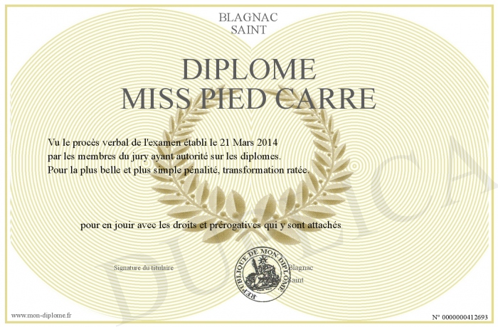 Envoyez par email votre Diplôme Miss Pied Carré personalisé