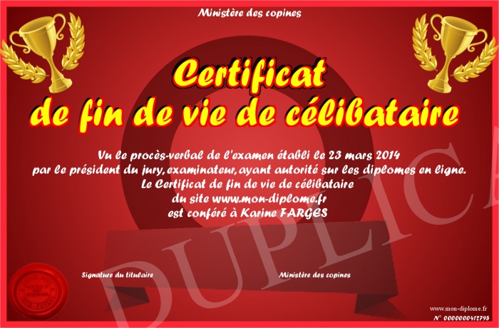 Envoyez par email votre Certificat de fin de vie de célibataire personalisé