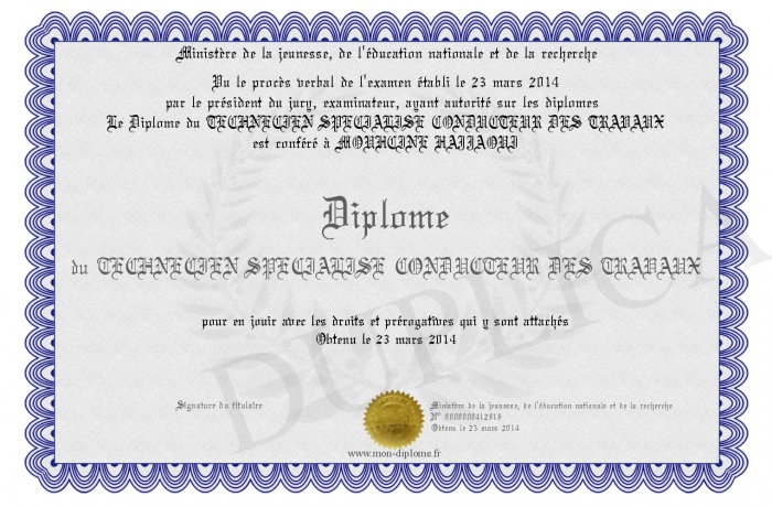 Envoyez par email votre Diplôme du TECHNECIEN SPECIALISE CONDUCTEUR DES TRAVAUX personalisé