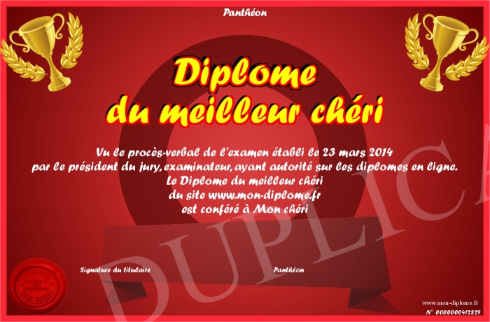Envoyez par email votre Diplôme du meilleur chéri personalisé
