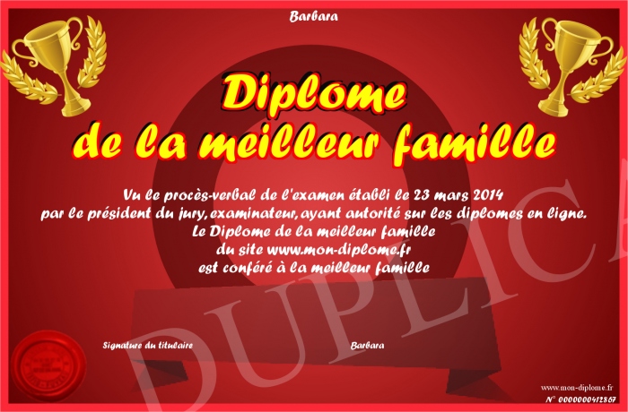 Envoyez par email votre Diplôme de la meilleur famille personalisé