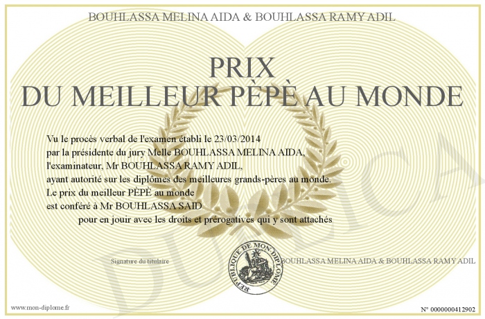 Envoyez par email votre PRIX DU MEILLEUR PÈPÈ AU MONDE personalisé