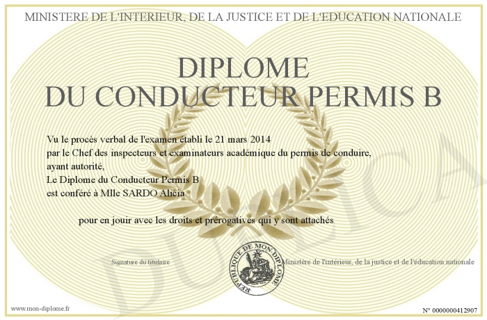 Envoyez par email votre Diplôme du Conducteur Permis B personalisé