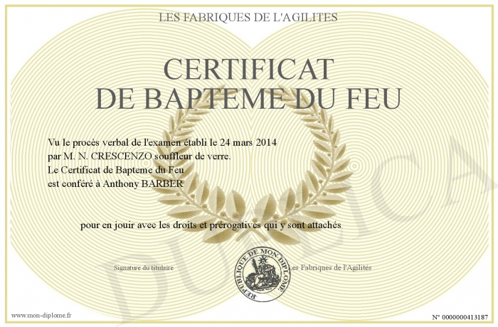 Envoyez par email votre Certificat de Bapteme du Feu personalisé