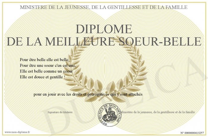 Envoyez par email votre Diplôme de la meilleure soeur-belle personalisé