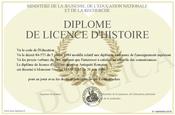 Envoyez par email votre Diplôme de licence d'Histoire personalisé